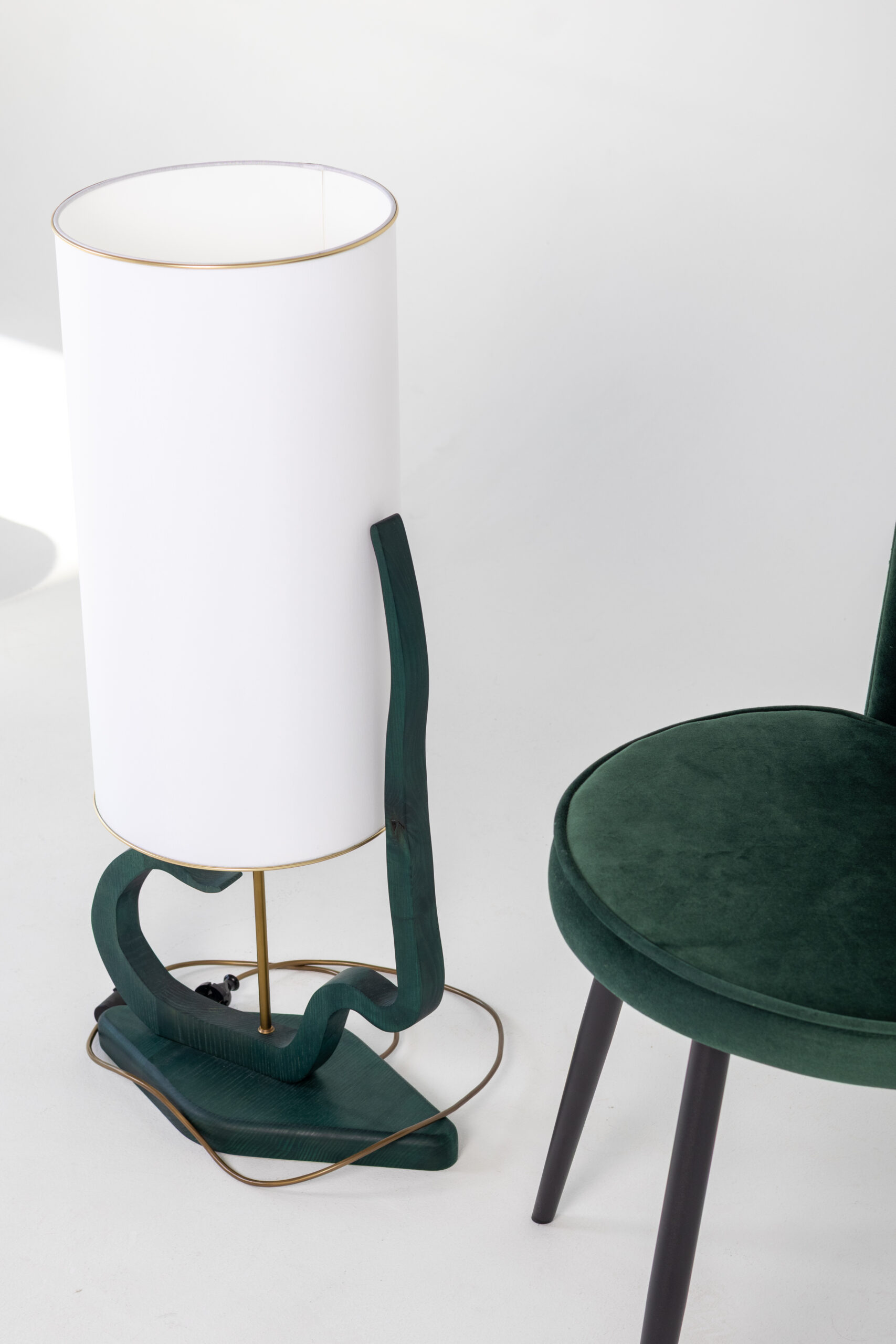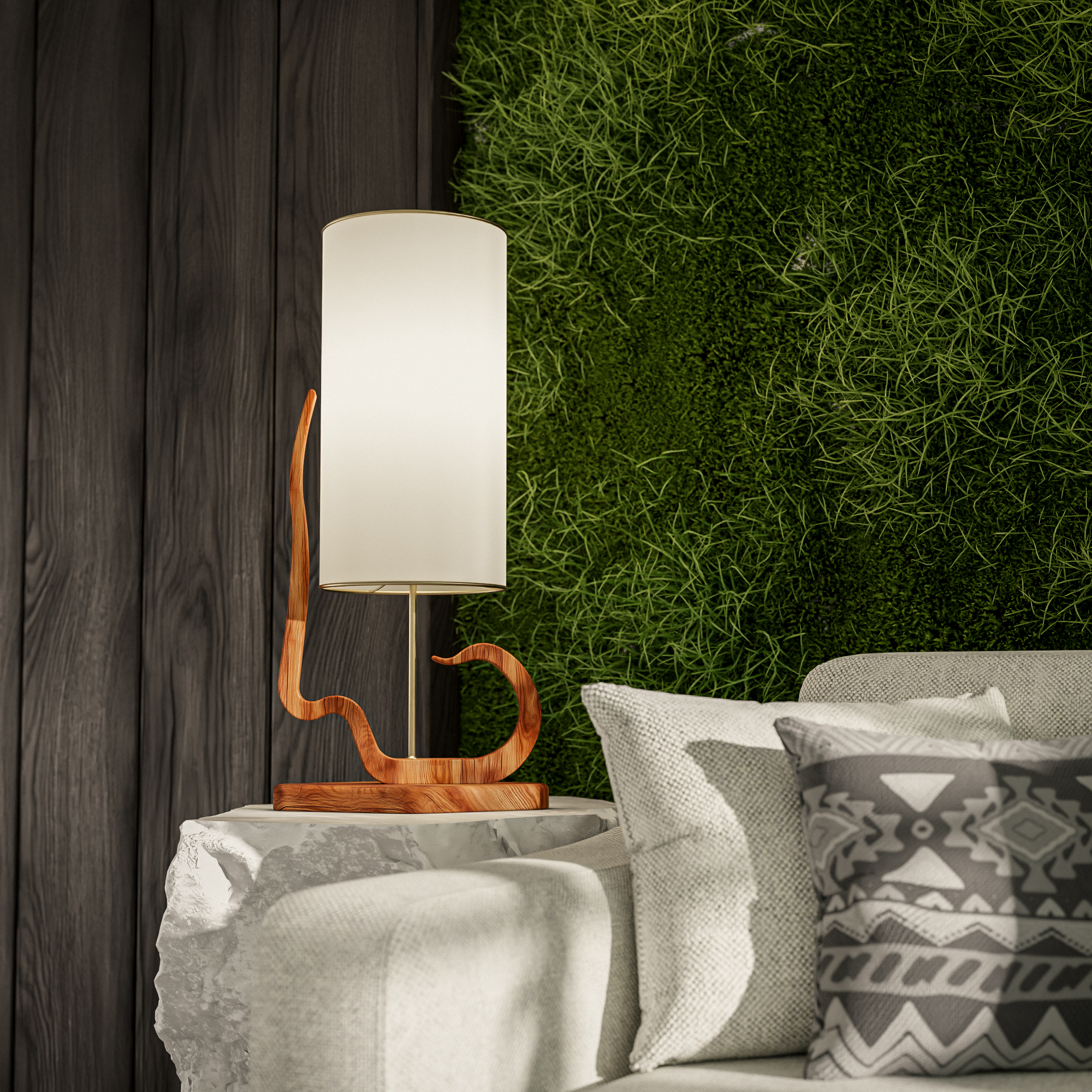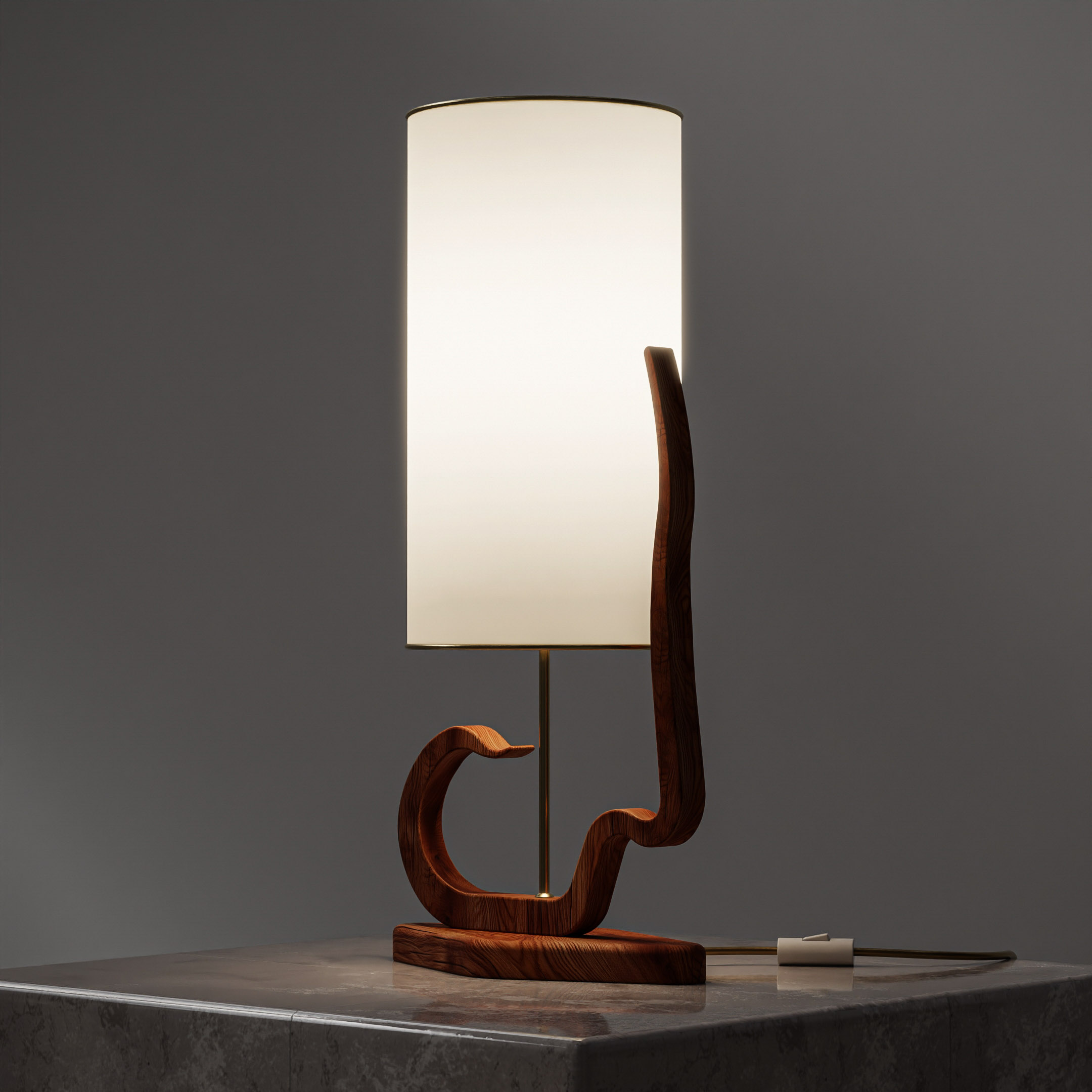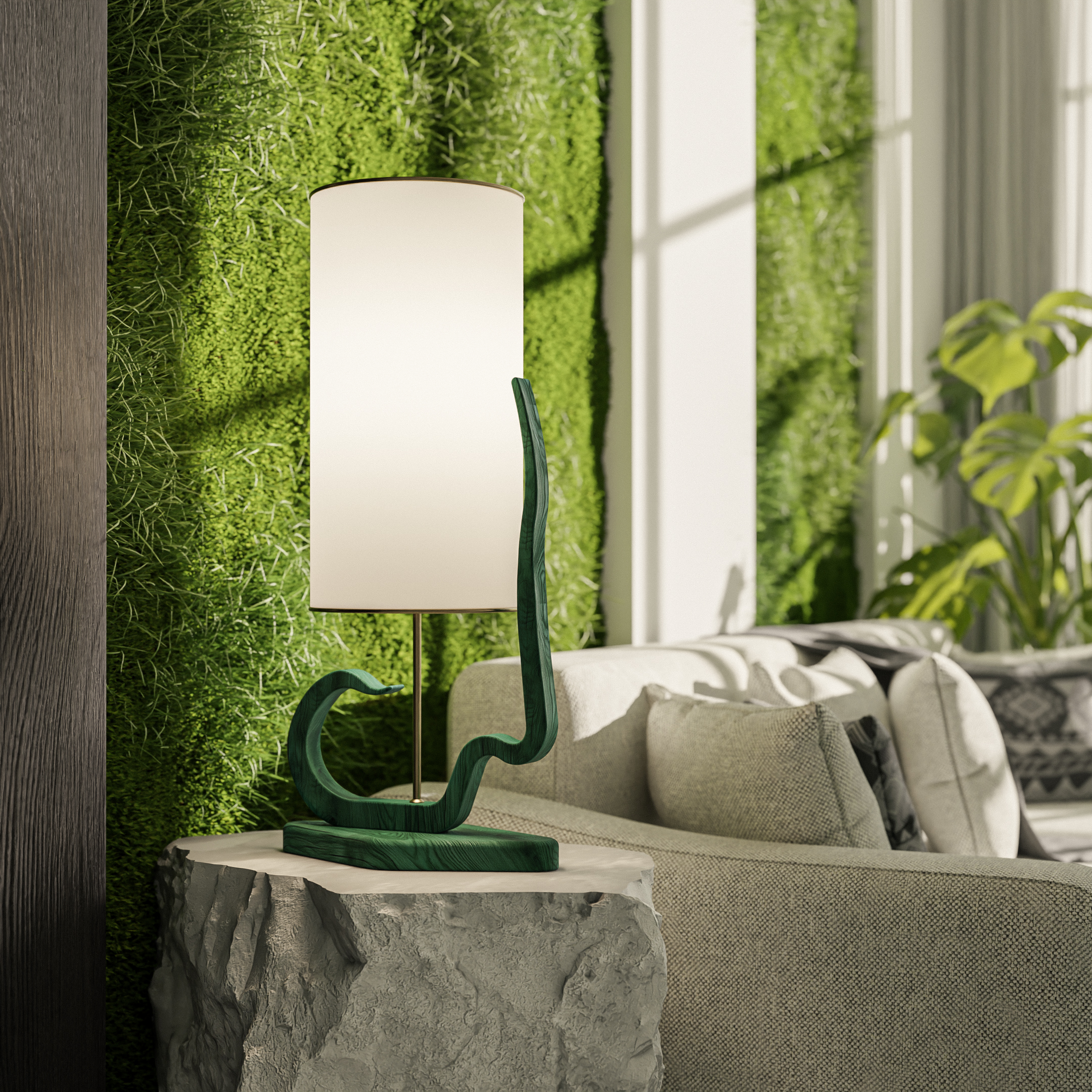 Lampa stołowa z cylindrycznym kloszem i niestandardową podstawą, oparta na płynnej, asymetrycznej linii. Podstawa pełni funkcję stabilizującą i dekoracyjną, a jej kontur jest dynamiczny. Całość podtrzymuje pionowy słup, łączący elementy bez wizualnego przeładowania. Forma lampy balansuje między funkcją użytkową a estetycznym wyglądem, doskonale uzupełniając przestrzenie, w których liczą się detale i wyrazisty design.
