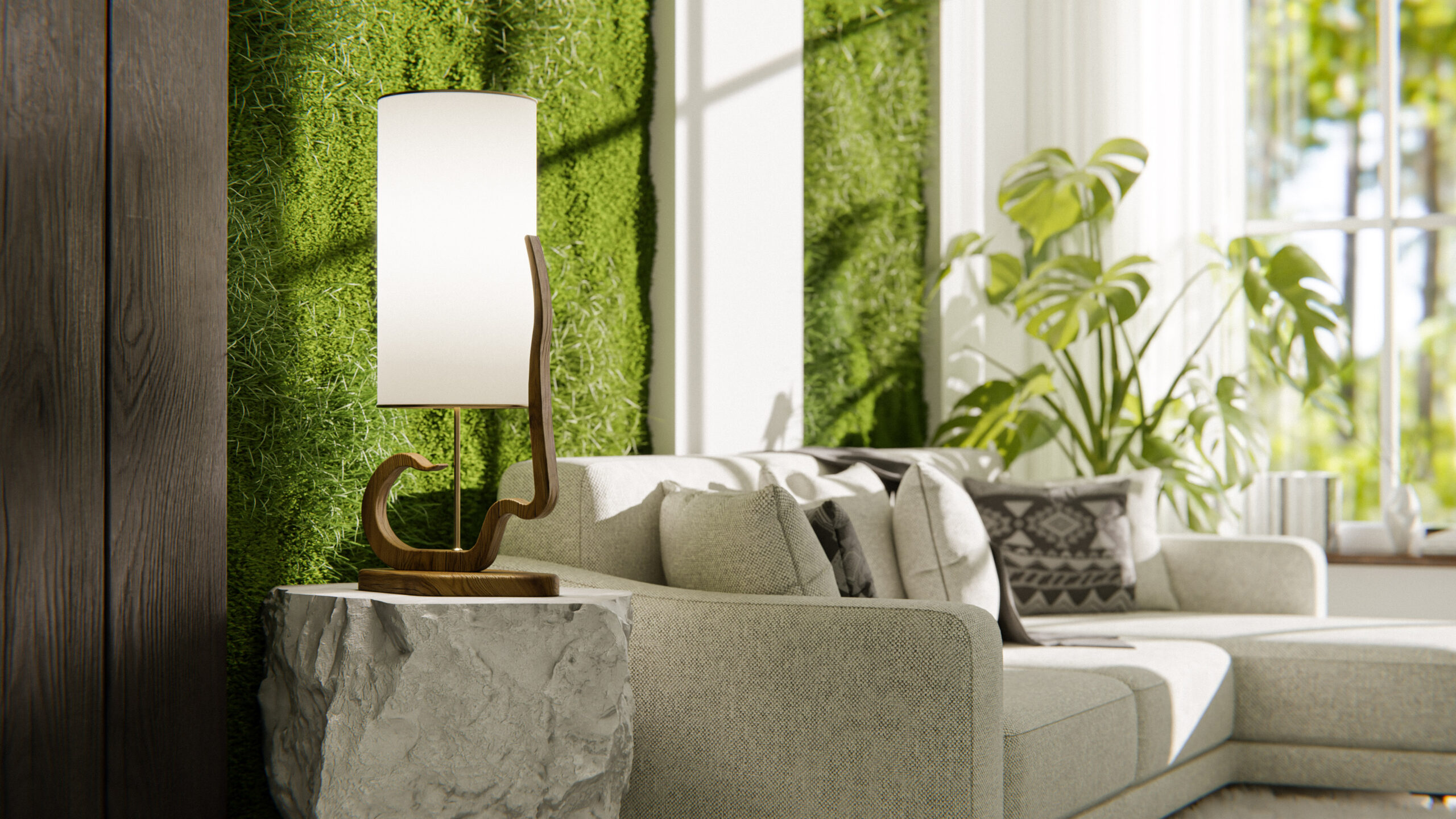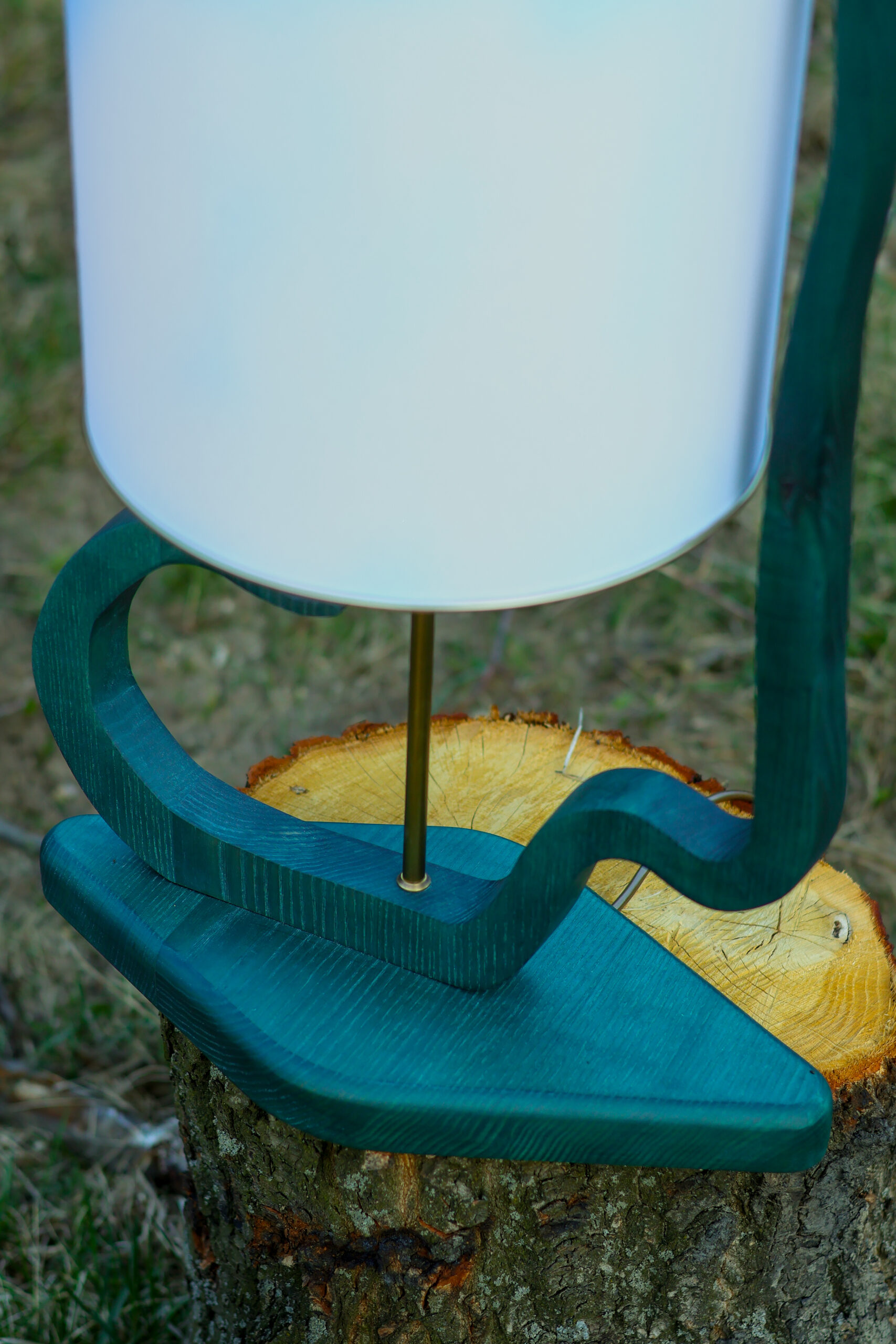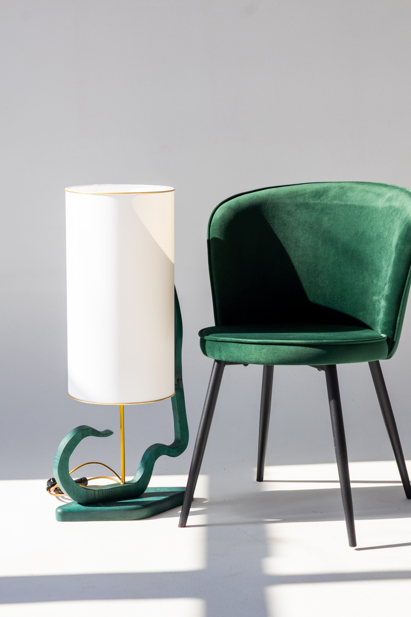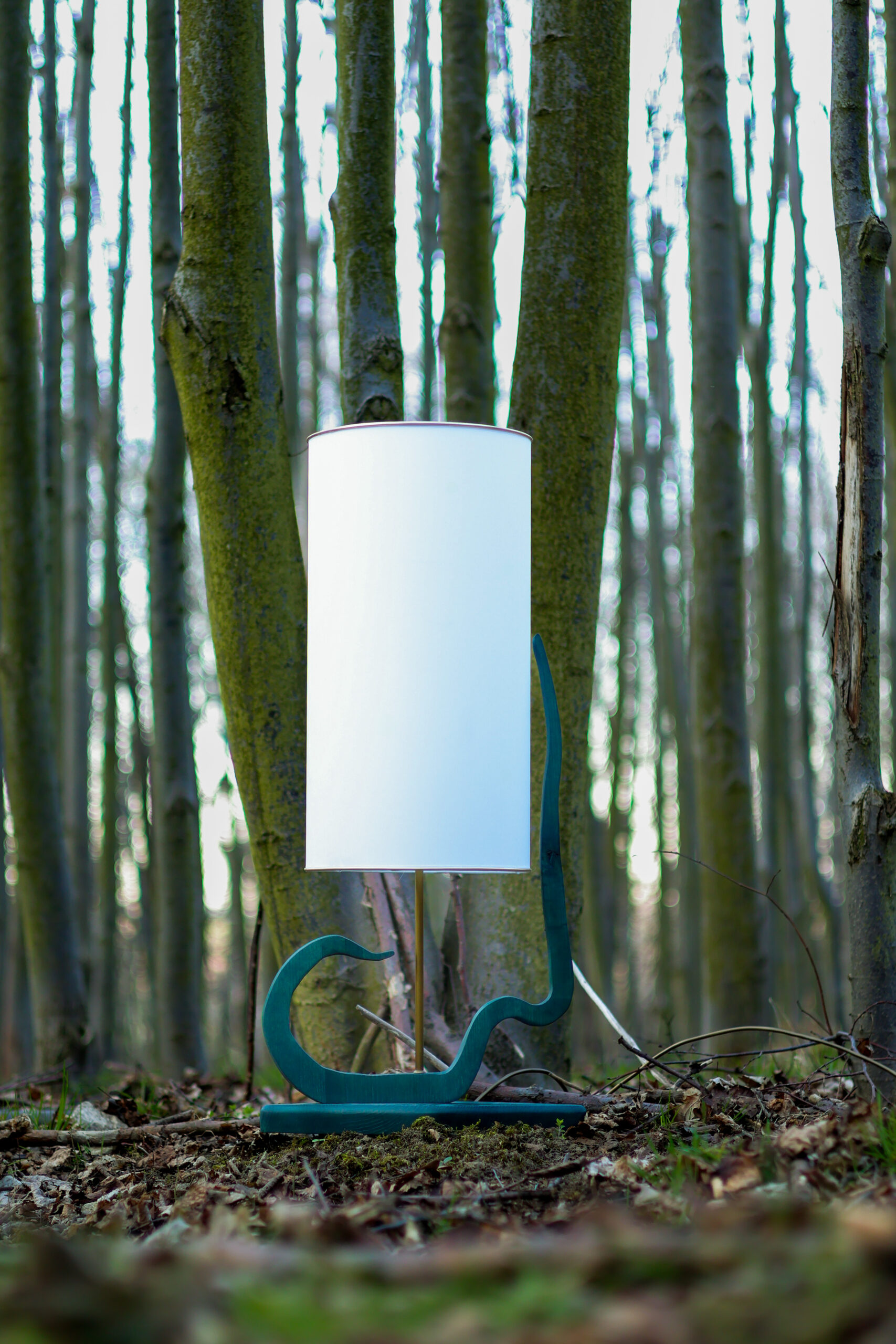 Lampa stołowa z cylindrycznym kloszem i niestandardową podstawą, oparta na płynnej, asymetrycznej linii. Podstawa pełni funkcję stabilizującą i dekoracyjną, a jej kontur jest dynamiczny. Całość podtrzymuje pionowy słup, łączący elementy bez wizualnego przeładowania. Forma lampy balansuje między funkcją użytkową a estetycznym wyglądem, doskonale uzupełniając przestrzenie, w których liczą się detale i wyrazisty design.